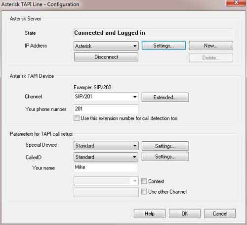 Anschließend sind die Parameter in der Sektion "Asterisk TAPI Gerät" einzugeben. Der Dialog Screenshot zeigt ein Beispiel für ein SIP-Telefon mit der Nebenstellennummer "201".