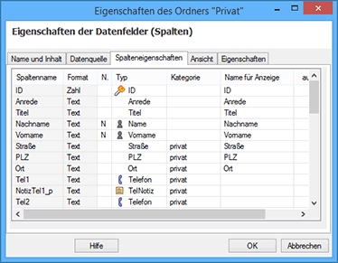 In diesem Dialog können Sie alle Spalten auswählen, deren Inhalt die Sie folgend anzeigen/bearbeiten wollen. Die Spalten können Sie beim erstmaligem Verknüpfen einer Datenquelle auswählen oder auch im Nachhinein ändern über die Ordner-Eigenschaften.