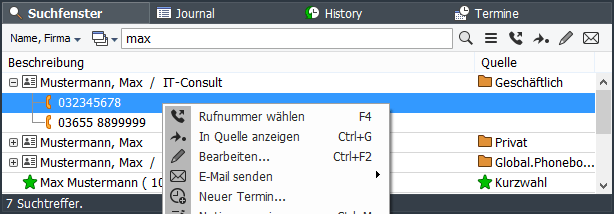Eine weitere Möglichkeit der globalen Suche bietet die kombinierte Eingabe- und Suchzeile im PhoneDialog. Die Trefferliste wird als Popup-Liste angezeigt und ist auf maximal 40 Suchtreffer begrenzt. Es wird ein vorgegebener Quellfilter für Telefonbuch+Kurzwahl verwendet. Der Filter für die Auswahl der Suchfelder kann unter [Optionen > Telefonie] angepasst werden.