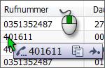 Klicken Sie mit der mittleren Maustaste auf eine Rufnummer in einer beliebigen Anwendung. Der PhoneSuite CTI Client versucht darauf hin die Rufnummer zu erkennen und zeigt ein kleines Popup-Menu zur Wahlausführung an. Die Wahl per Mausklick ist zu aktivieren über: [Optionen > Telefonie > Wahl aus anderen Anwendungen heraus]