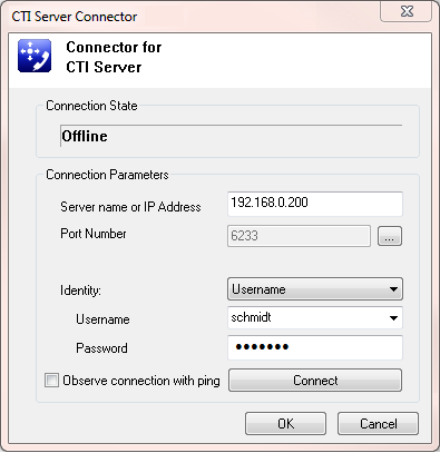 In diesem Dialog sind die IP-Adresse des CTI Servers sowie die Zugangsdaten einzutragen.