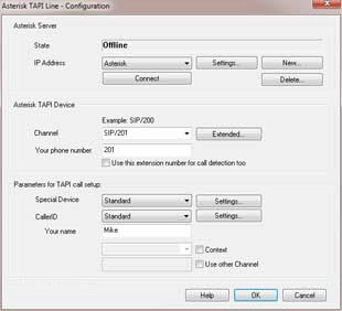 Anschließend sind die Parameter in der Sektion "Asterisk TAPI Gerät" einzugeben. Der Dialog Screenshot zeigt ein Beispiel für ein SIP-Telefon mit der Nebenstellennummer "201".