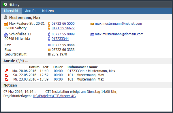 Die History zeigt Statistik-Informationen zum aktuell selektierten Kontakt/Anruf in Form mehrerer HTML-Seiten an. Auf der Seite "Übersicht" werden Kontaktinformationen, eine Übersicht der letzten Anrufe und Notizeinträge angezeigt. Die Seite "Anrufe" zeigt eine Anruf-Statistik der letzten Monate und listet alle verfügbaren Anrufe auf. Auf der Seite "Notizen" werden alle verfügbaren Notizen angezeigt.