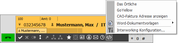 Der folgende Screenshot zeigt den manuellen Aufruf einer Steuersequenz mit Hilfe des "Interworking-Buttons" auf dem PhoneDialog. Die zu übertragenden Daten beziehen sich auf den aktuell selektierten Call-Tab.