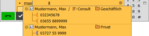 Eine weitere Möglichkeit der globalen Suche bietet die kombinierte Eingabe- und Suchzeile im PhoneDialog. Die Trefferliste wird als Popup-Liste angezeigt und ist auf maximal 40 Suchtreffer begrenzt. Es wird ein vorgegebener Quellfilter für Telefonbuch+Kurzwahl verwendet. Der Filter für die Auswahl der Suchfelder kann unter [Optionen > Telefonie] angepasst werden.