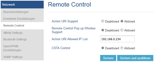 - "Action URI Support" muss auf "Aktiviert" stehen, damit das Telefon CTI-Aktion per HTTP generell zulässt.