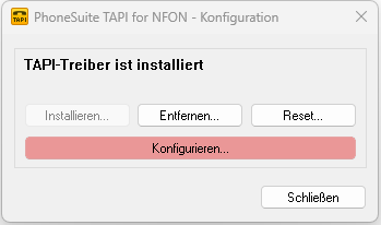 Die Treiber-Konfiguration können Sie aufrufen über: [Start > Programme > PhoneSuite_TAPI_for_NFON > PhoneSuite TAPI for NFON - Konfiguration]