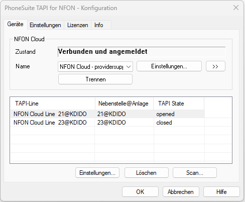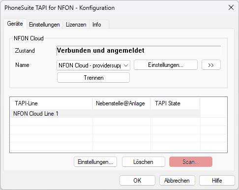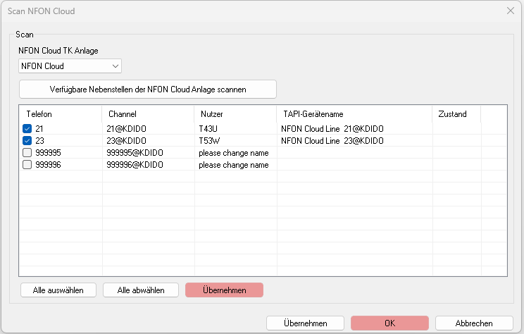 • Es werden die Nebenstellen der NFON-Anlage ausgelesen und können als TAPI-Lines übernommen werden.